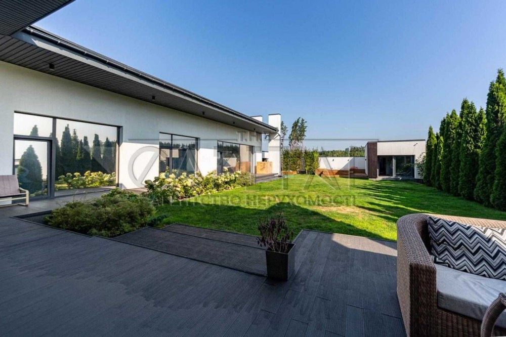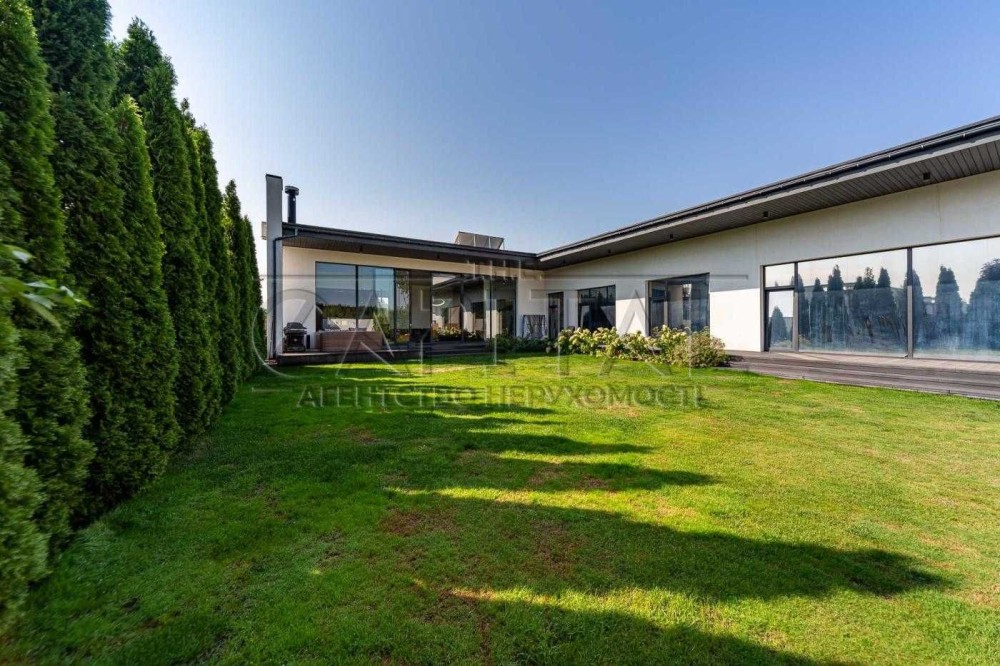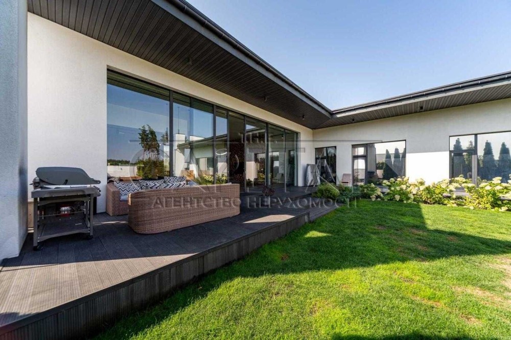 Продається ультрасучасний, одноповерховий будинок в стилі HI-TECH, побудований за індивідуальним проєктом в котеджному містечку класу преміум "Белгравія". Цей котедж розташований всього в 7 км від Києва на території, що оточена лісом.