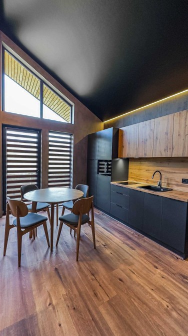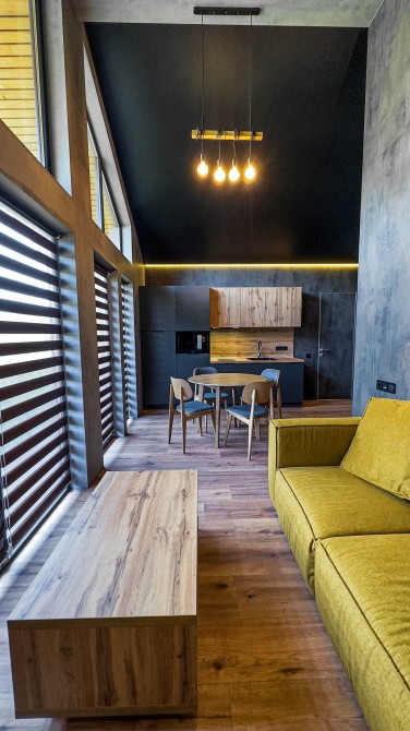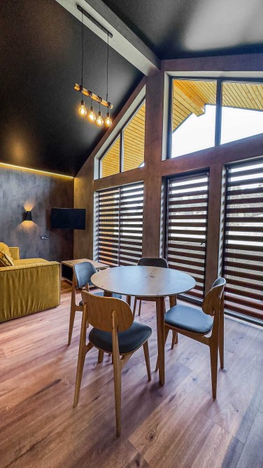 Шале з панорамними вікнами, має 1 спальню та вітальню з кухнею, Біля котеджу можна відпочити у альтанці на свіжому повітрі та скористатись мангалом. В котеджі можуть зручно розміститись 2 осіб та 2 додаткових місця на дивані у вітальні.