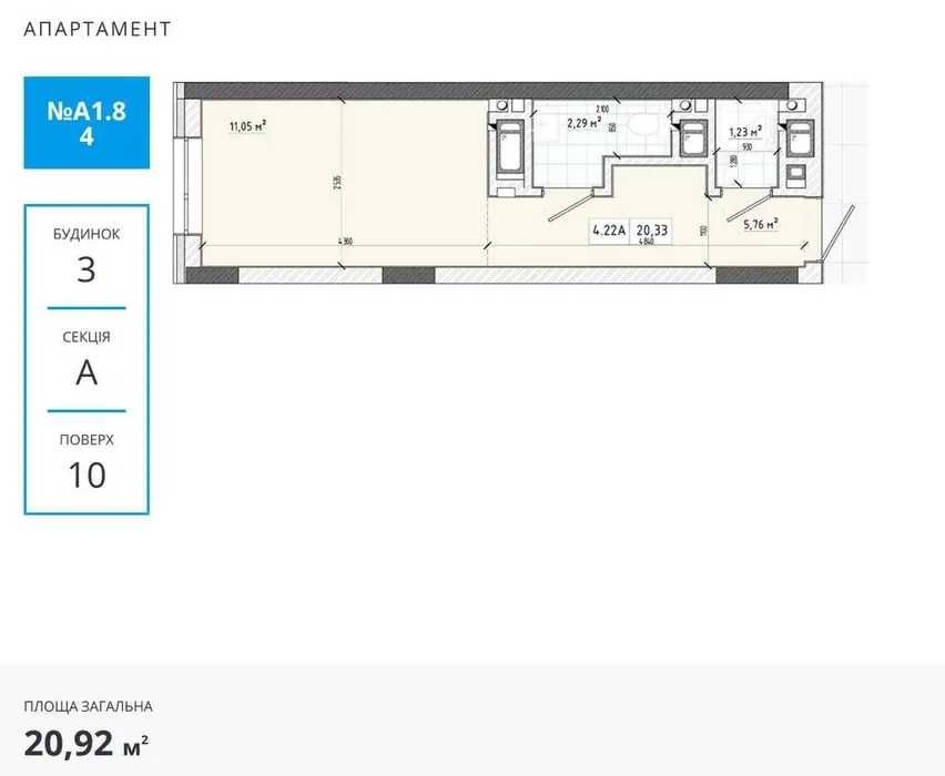 Продаж апартаментів площею 20,92 м² на 10 поверсі (будинок 3, секція А). Планування компактне та продумане: основна кімната 11 м², передбачене місце під кухню, санвузол і коридор. Завдяки раціональному плануванню кожен метр використано максимально ефективно.