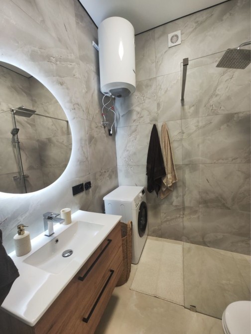 Санвузол облаштований душовим трапом, підвісним унітазом та дзеркалом із підсвіткою.