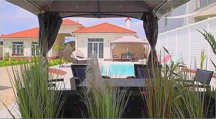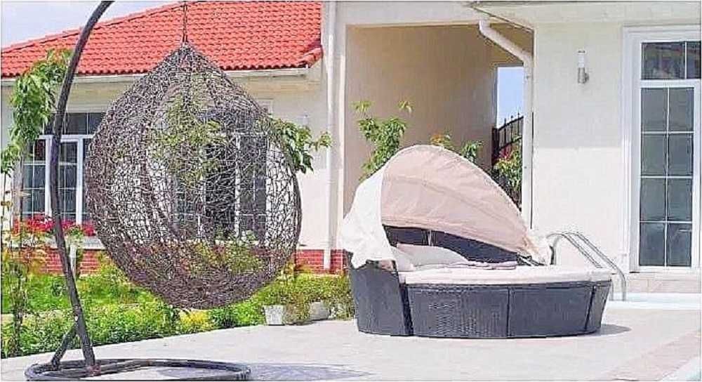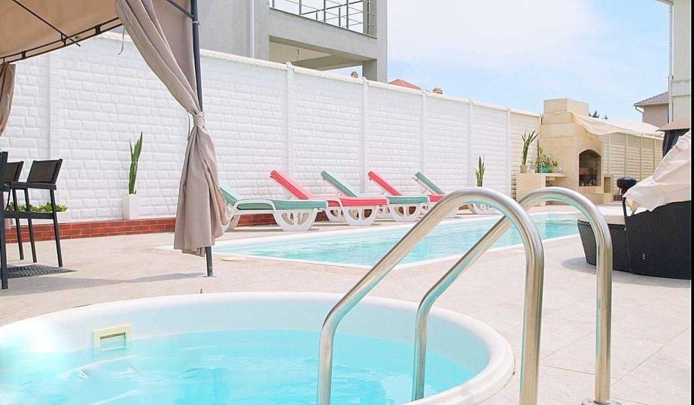15 соток, два бассейна (один из бассейнов с гидромассажем), летняя мебель, зона барбекю, на территории есть отдельно стоящий домик для отдыха, с сауной и тренажерами.