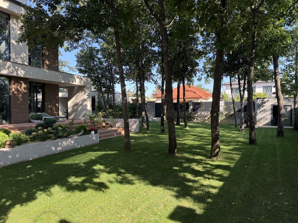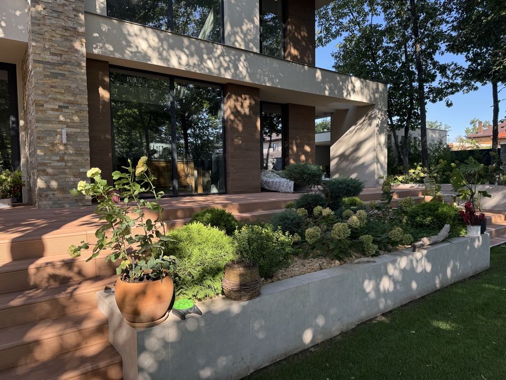 Выполнен ландшафтный дизайн, высажены растения: туи, магнолия, камелии, гортензии. На участке были сохранены дубы.