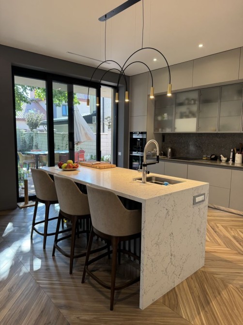 3. Бытовая техника: встроенная кофе машина, варочная поверхность, духовка, посудомоечная машина, встроенный холодильник, стиральная машина, сушительная машина, все фирмы Siemens. Дополнительный холодильник фирмы Liebherr, микроволновка.