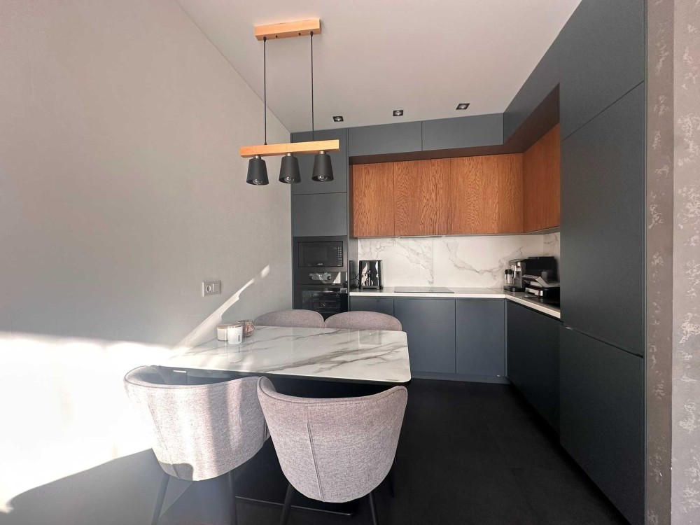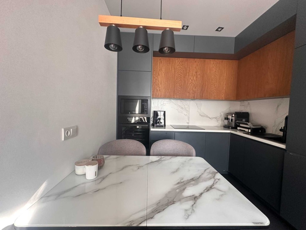 Вас приємно здивує площа кухні-вітальні, в якій продуманий кожен квадратний метр. Окремо виділена робоча зона кухні, яку від зони відпочинку розділяє обідній стіл, за яким розмістяться усі ваші гості.