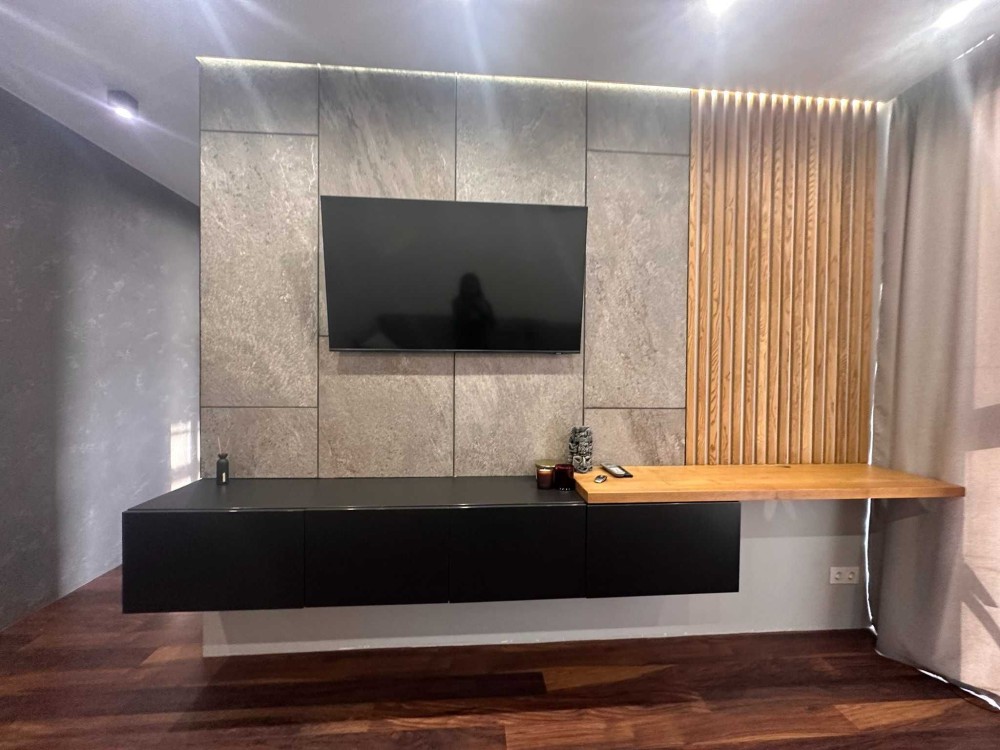 Стіни миючі обої, комбіновані з декоративною штукатуркою, стильна стіна викладена з керамограніту.
