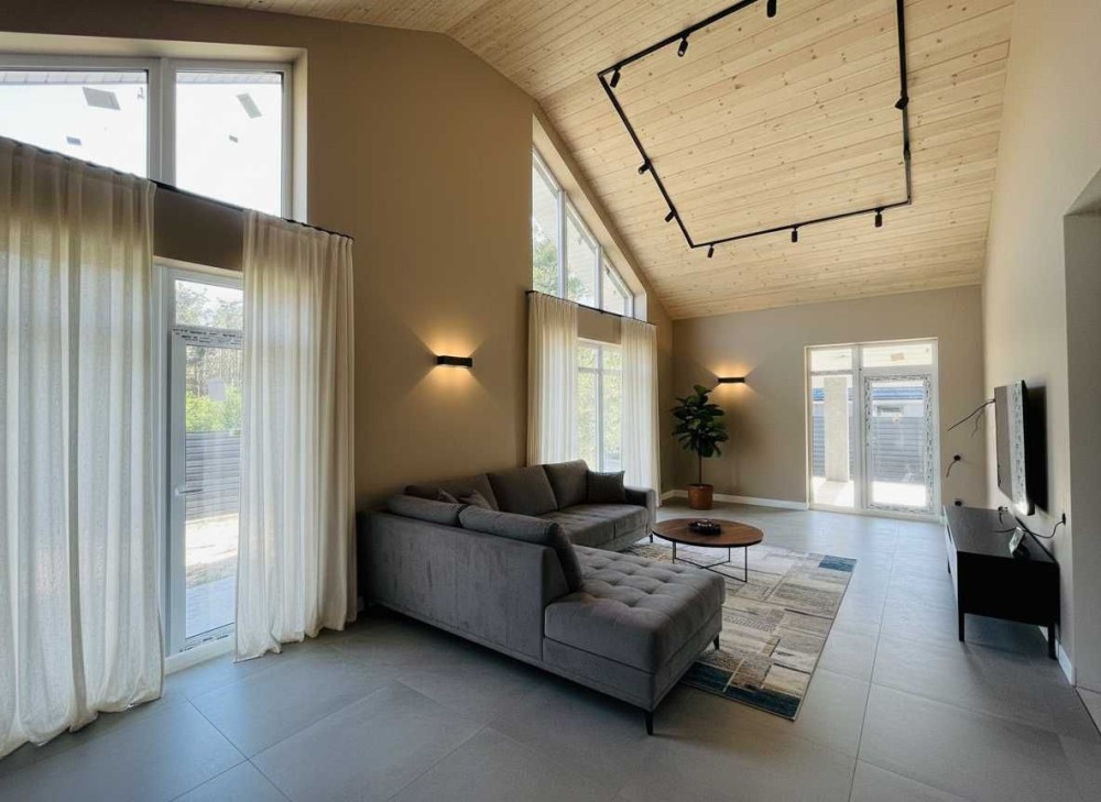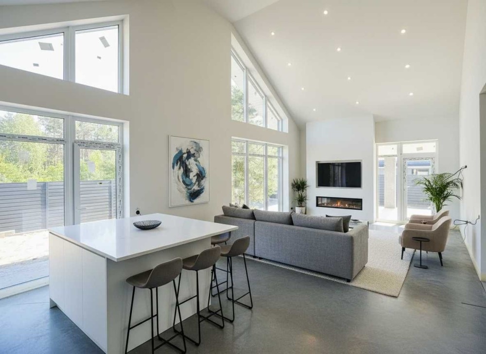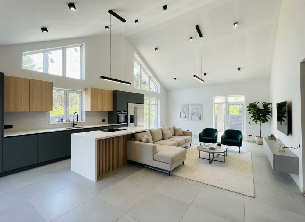 Простора кухня-вітальня площею 50 кв.м. з великими панорамними вікнами, зоною відпочинку та другим світлом наповнює будинок світлом і створює відчуття простору.