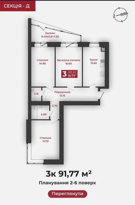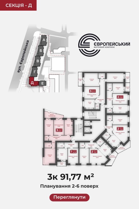 Трикімнатна квартира площею 91,77 м2 на 5 поверсі в новобудові ЖК «Європейський» на вулиці Європейська, 183 м. Полтава, поруч із McDonald’s.