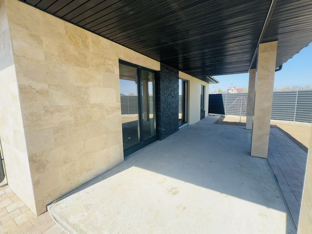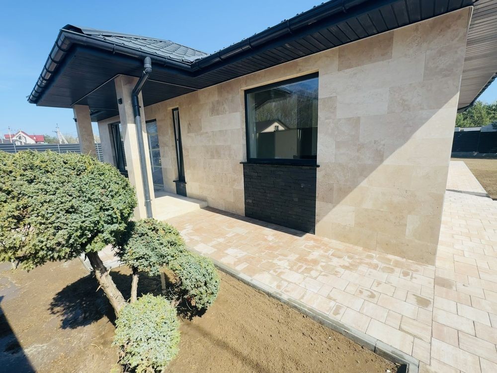 • фасад — натуральний травертин і сланець