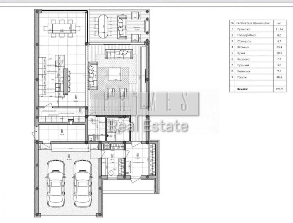 Загальна площа будинку 390 кв. (144 кв.м. - житлова площа; 50 кв.м. - гараж; 50 кв.м. - тераса;)