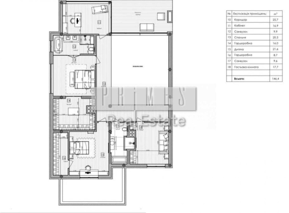 Господарська спальня з повноцінною гардеробною кімнатою, зонованою на чоловічу та жіночу частини. Просторий санвузол.