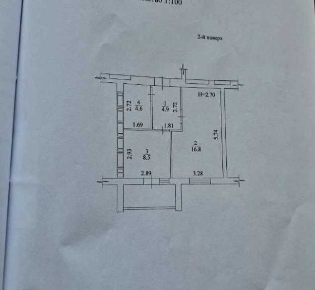 Загальна площа 36.6м². Кімната 16.8м², кухня 8.5м² з виходом на балкон.