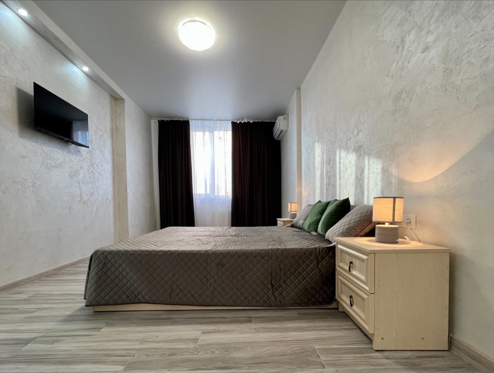Квартира розташована на зручному 2 поверсі з виглядом з вікон на затишний двір. Функціональне планування з великою кухнею, гардеробною і окремою спальнею. Квартира укомплектована меблями і технікою для комфортного проживання: двоспальне ліжко з ортопедичним матрацем, телевізор, кондиціонер, диван, вбудована кухня, гардеробна і т.і.