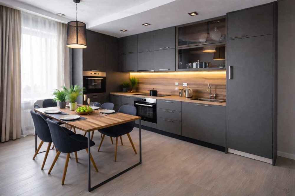 — кухня з наповненням: варильна поверхня, духовка, витяжка, мийка, змішувач, виводи під посудомийну машину