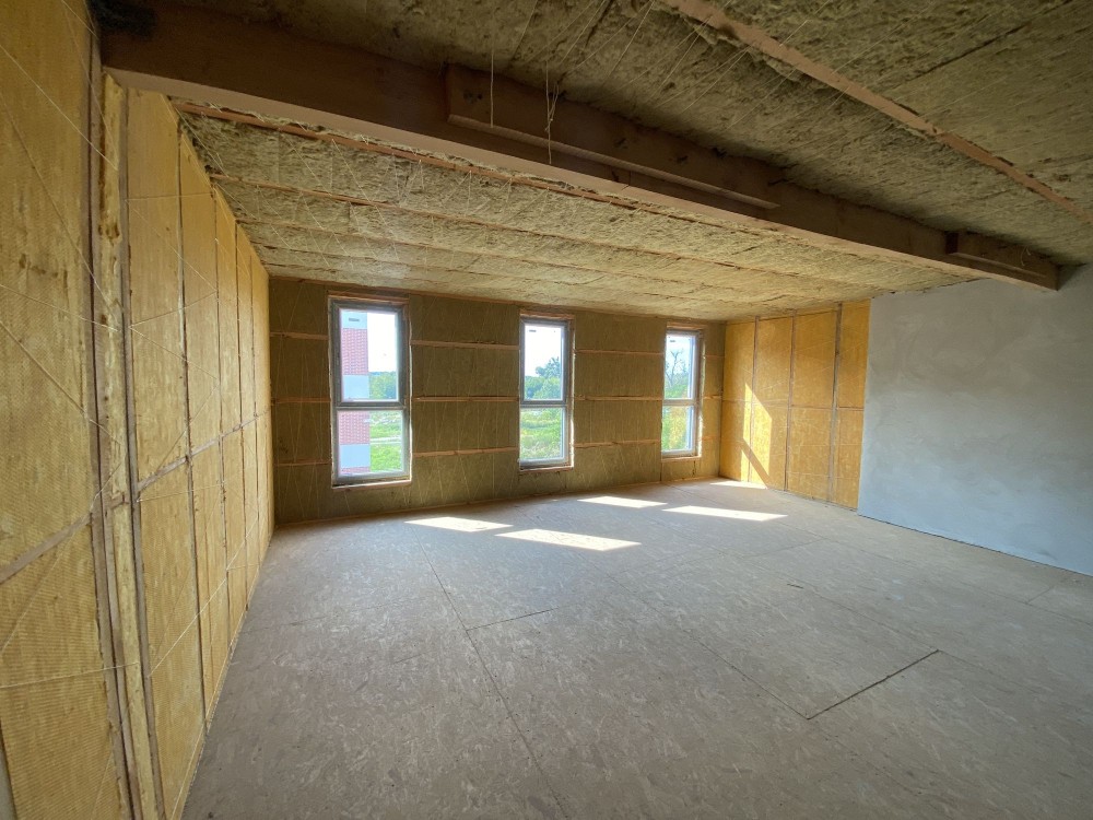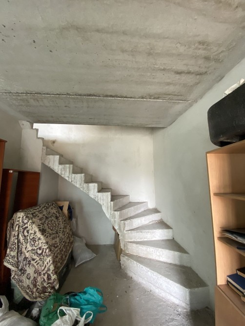 Продумане планування дозволяє облаштувати простору кухню-вітальню, декілька спалень, дитячу, гардеробну та кабінет. Бетонні сходи забезпечують надійність і довговічність. Формат підійде як для великої родини, так і для поєднання житла та роботи.