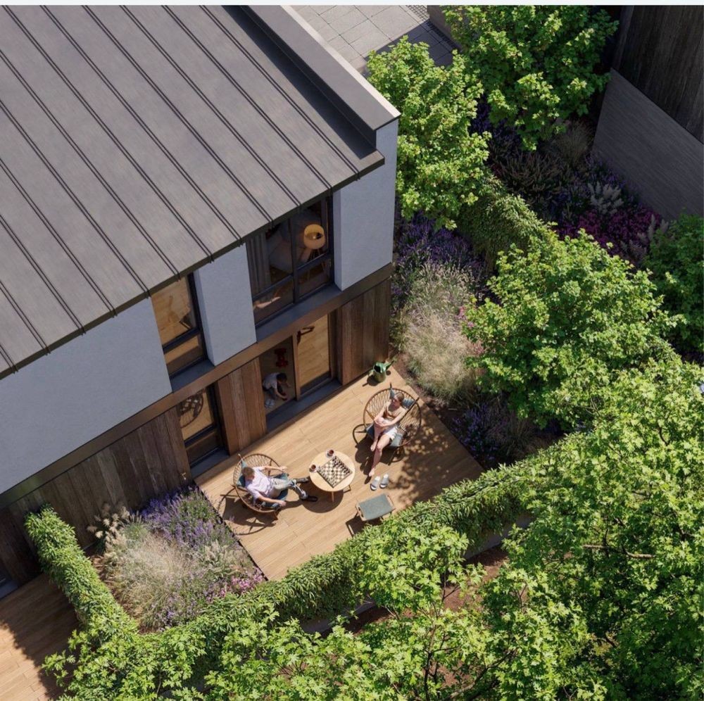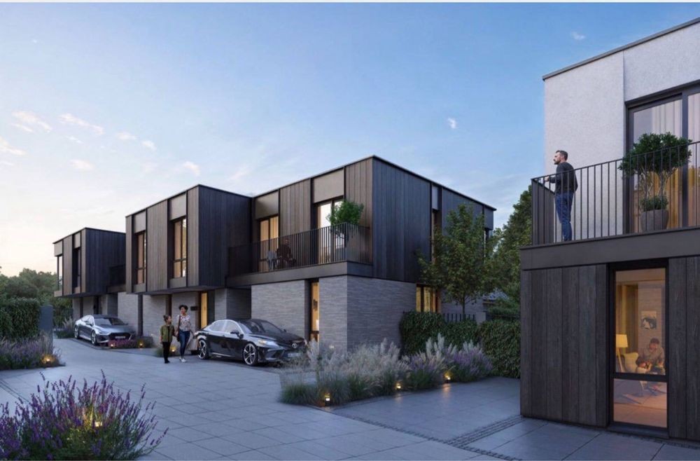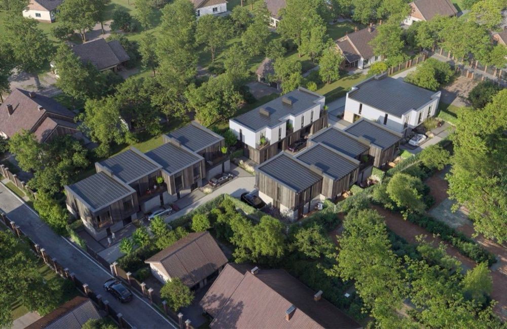 Продаж сучасних двоповерхових таунхаусів біля лісу та озера. Площа від 75-100м2, зручне та комфортне планування на два поверхи. Будинки збудовані з повнотілої цегли, мають лєнточний фундамент, утеплення пінопластом та односкатний дах, утеплений мінеральною ватою. Біля кожного будинку власна ділянка від однієї сотки і задній дворик для зони барбікю.