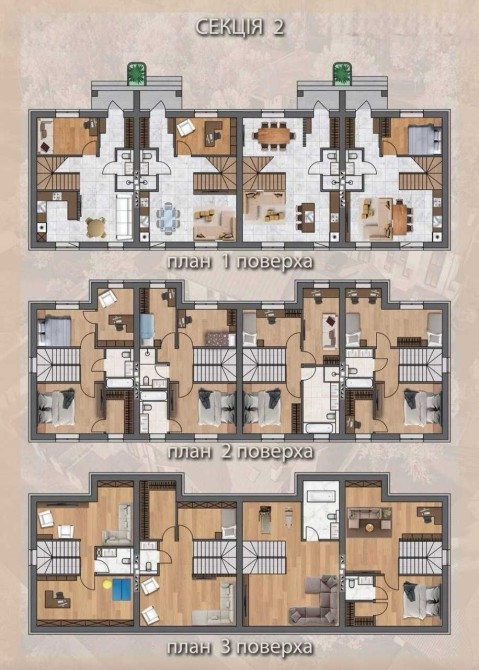 Архітектура комплексу виконана у сучасному стилі, що вже зарекомендувала себе якістю та єдиним гармонійним виглядом у реалізованому містечку. Продумані планування передбачають простору кухню-вітальню та санвузол на першому поверсі, зручні спальні кімнати та ванну на другому, а також простору мансарду, яку можна облаштувати під ще одну спальню, кабінет або ігрову.