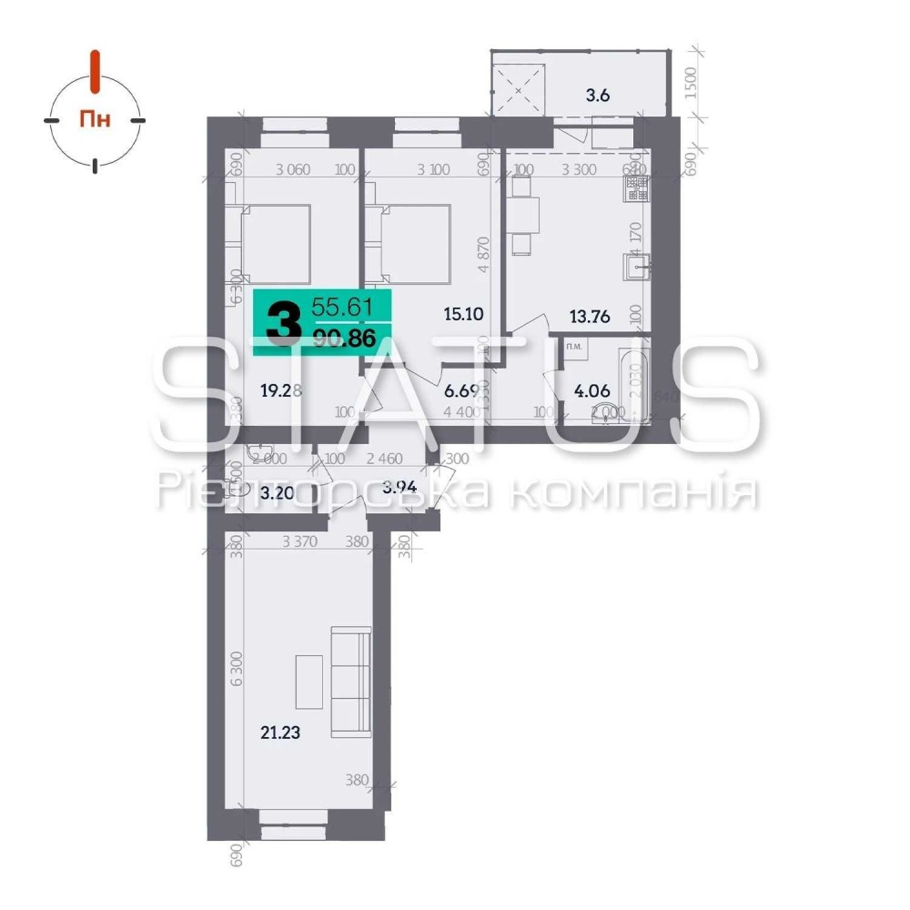 • Общая площадь 91 м2