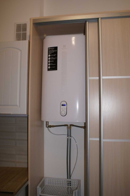 Кухня оснащена бойлером на 80 л, посудомийною машиною та вбудованим фільтром для очищення води. Є можливість підключення газу.