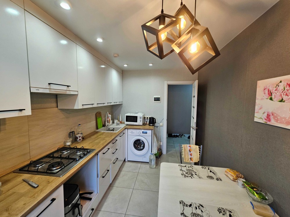Современная кухня: стильный светлый гарнитур, газовая варочная поверхность (огромный плюс при отключениях электричества!), большой холодильник, микроволновая печь, электрочайник и стиральная машина. Оборудована уютная обеденная зона.