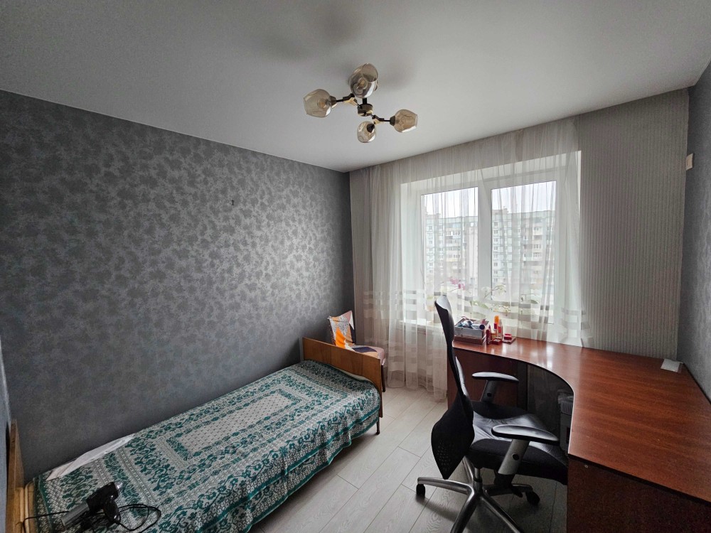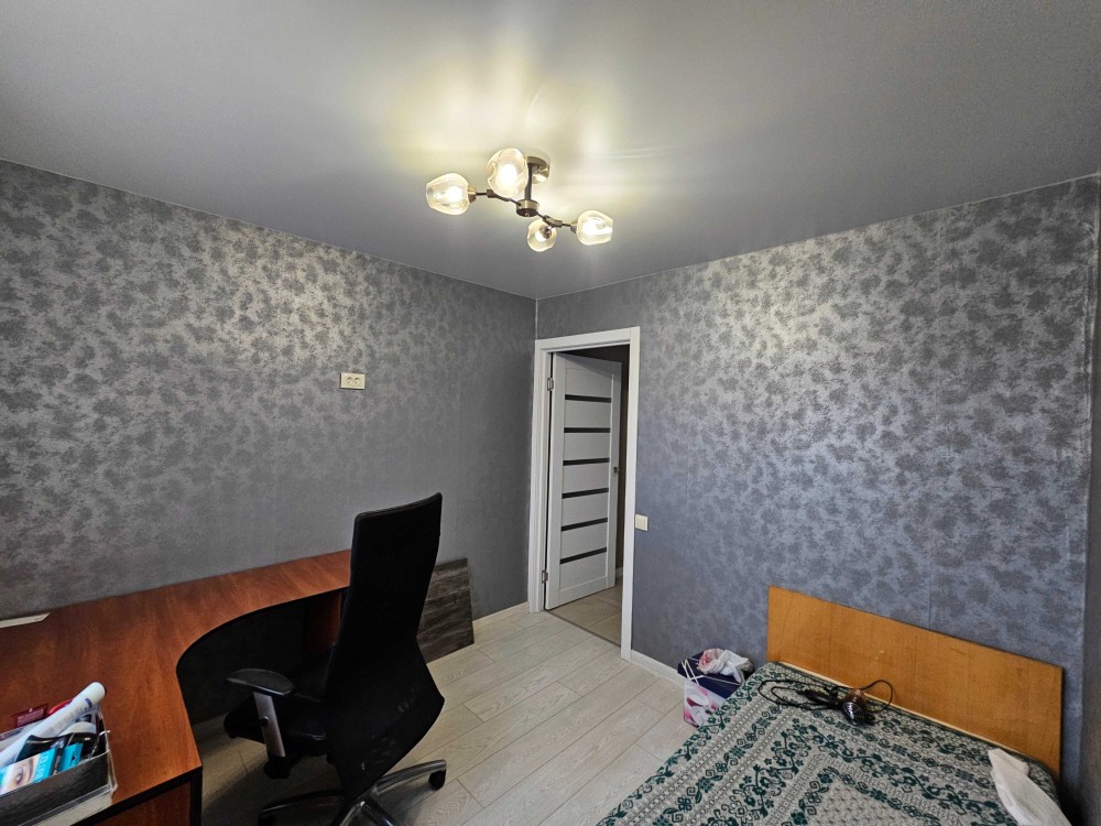 Вторая комната (кабинет/детская): идеально подойдет для удаленной работы или учебы. Установлен большой угловой письменный стол, эргономичное офисное кресло и односпальная кровать.