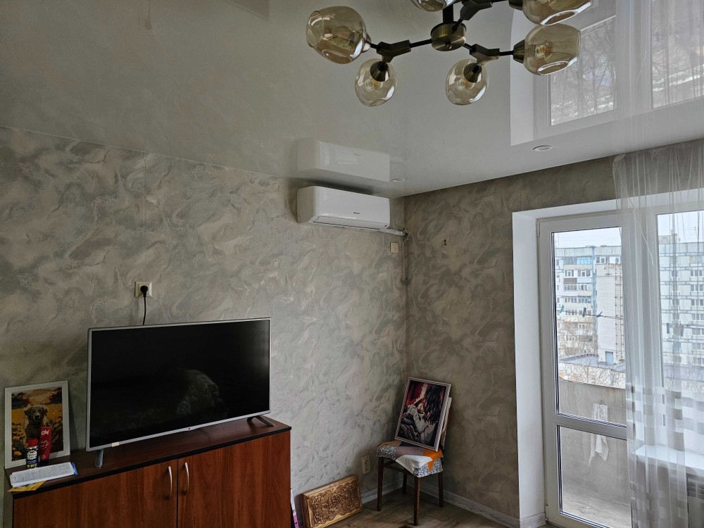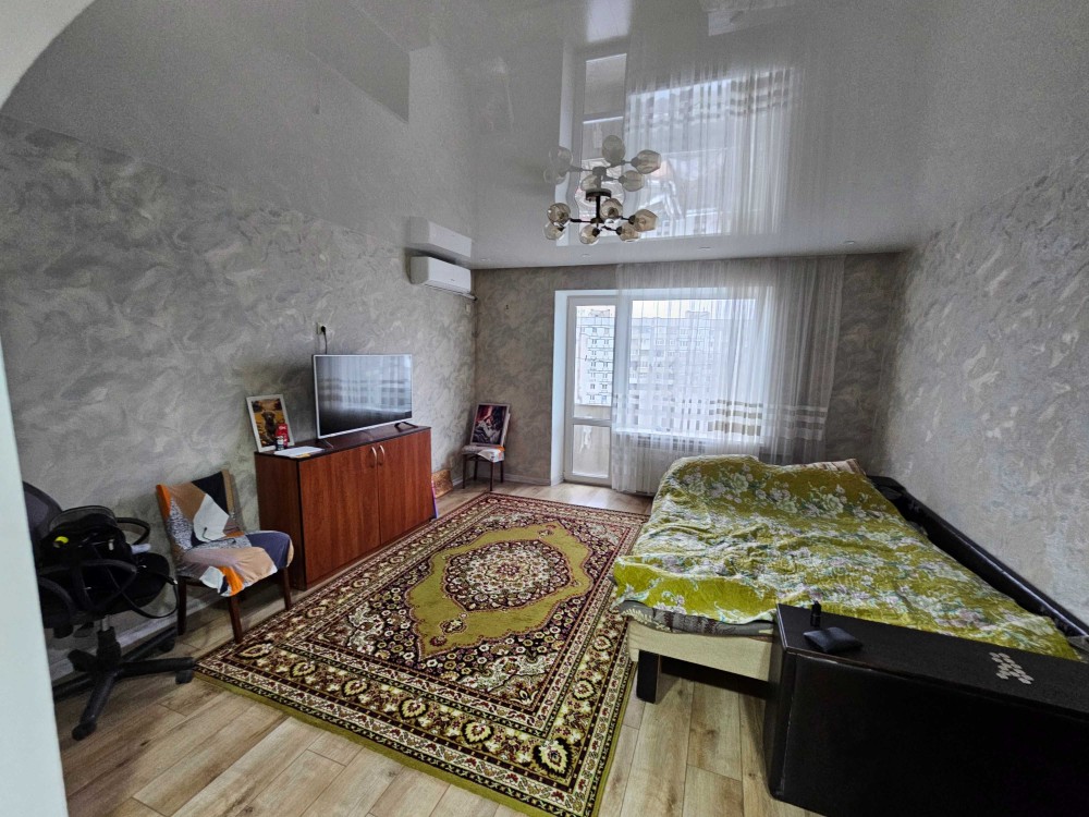 Основная комната: установлен кондиционер, есть телевизор, спальное место и выход на застекленный балкон. Натяжной потолок и светлые обои делают комнату очень просторной.