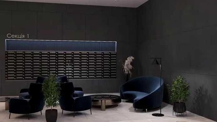 Презентабельне лобі з зоною очікування, лаунж-простір та відкрита тераса для відпочинку мешканців.