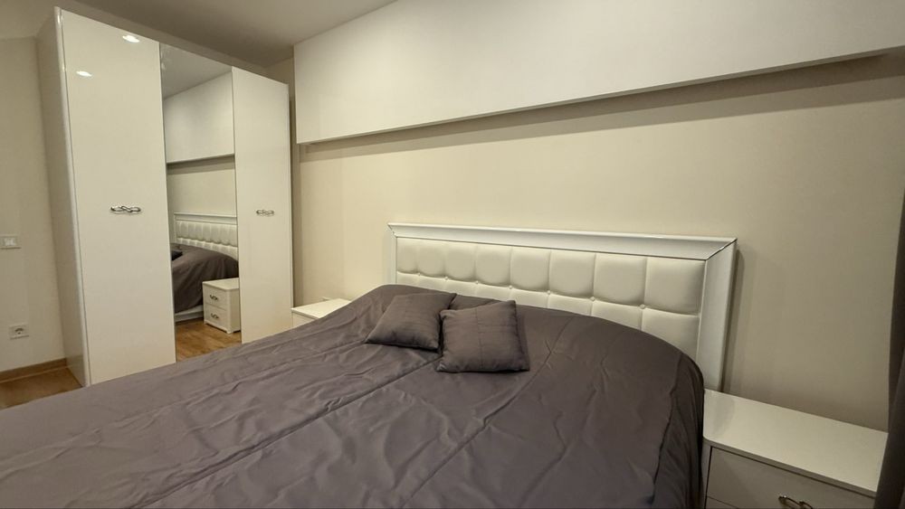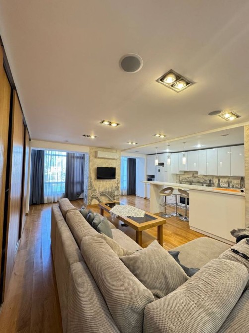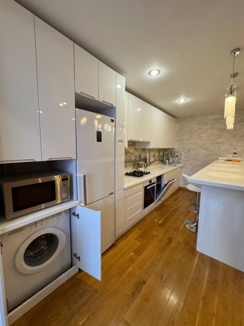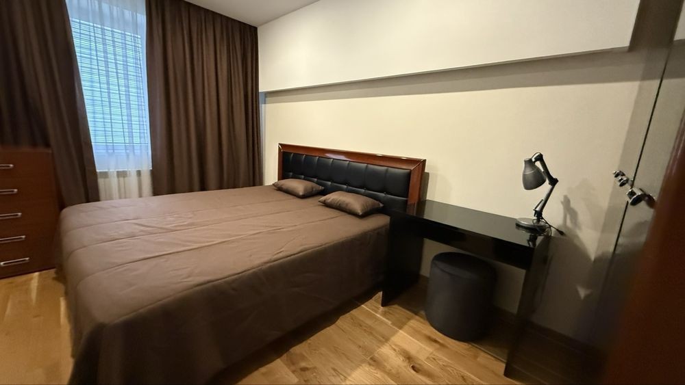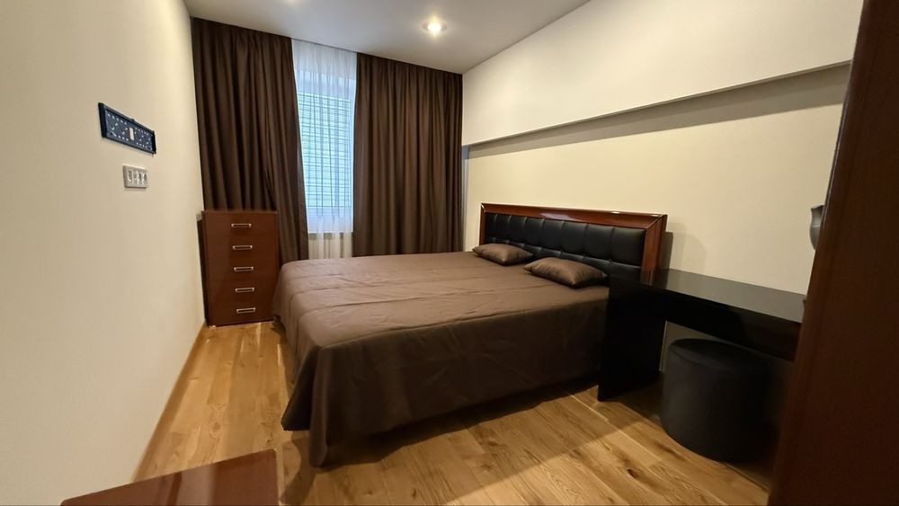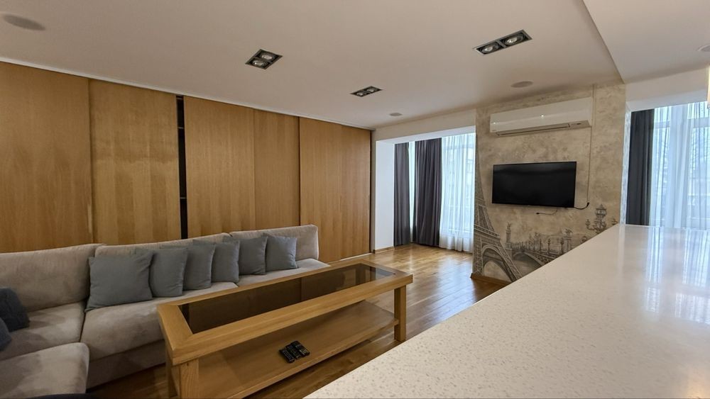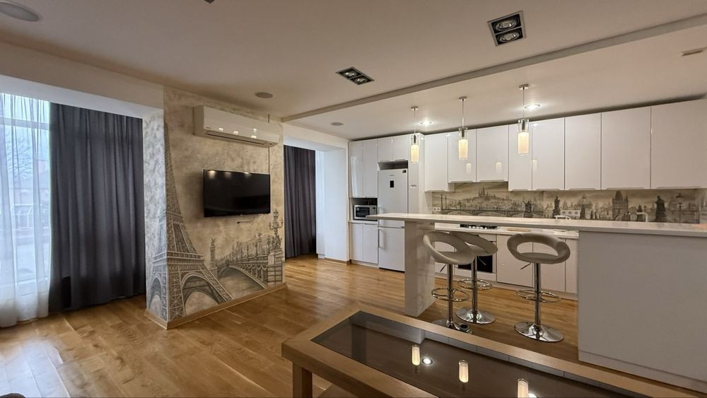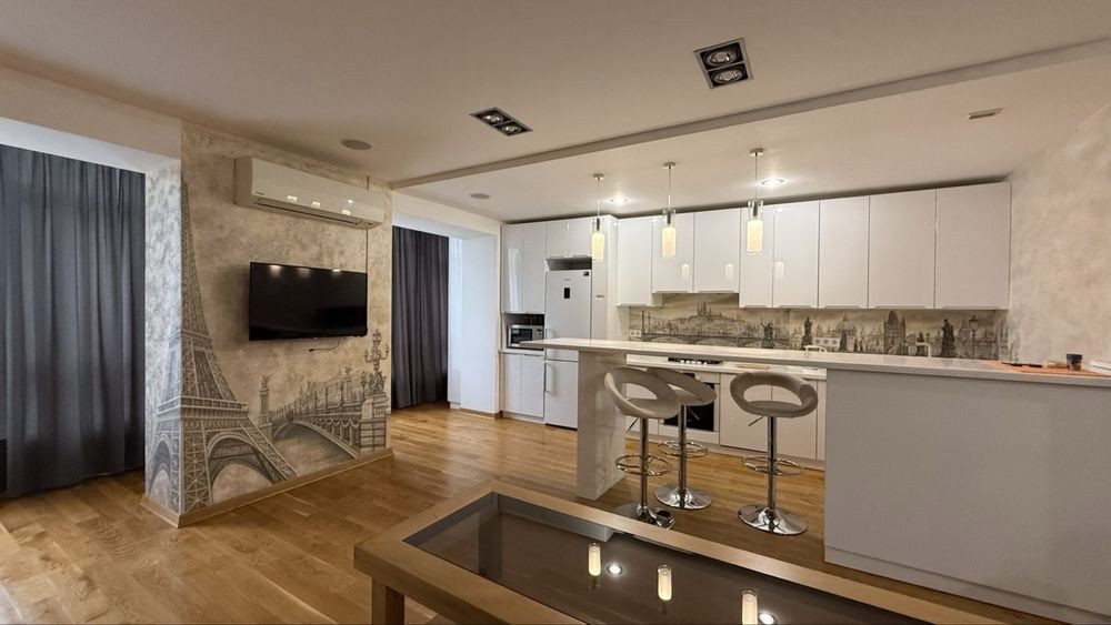 – простора кухня-студія ( холодильник, пральна та сушильна машини, посудомийна машина, газова поверхня, мікрохвильова, ел. чайник), розкладний диван, телевізор, кондиціонер та величезна шафа-купе, пилосмок