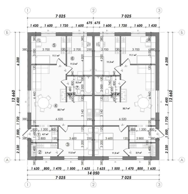 Планування передбачає простору вітальню (32,7 м²), три окремі кімнати (11–11,5 м² кожна), ванну кімнату (5,2 м²) та зручний передпокій.