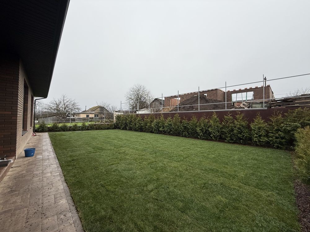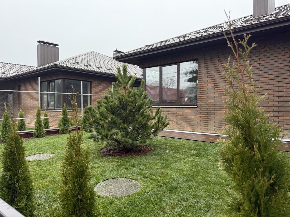 • Ділянка з газоном, декоративними деревами та автоматичним поливом.