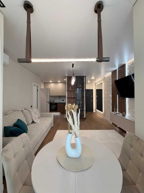 Інтерʼєр виконаний у сучасному дизайнерському стилі — світлі тони, якісні матеріали та продумані деталі, що роблять простір затишним і стильним.
