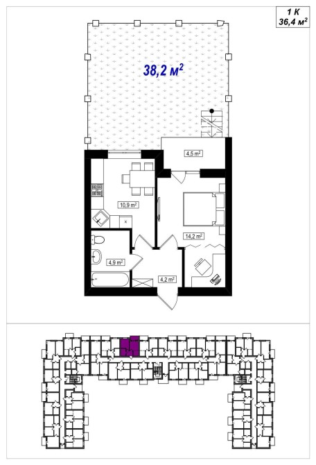 Квартира загальною площею 36,4 м2 має власну ділянку 38,2 м2