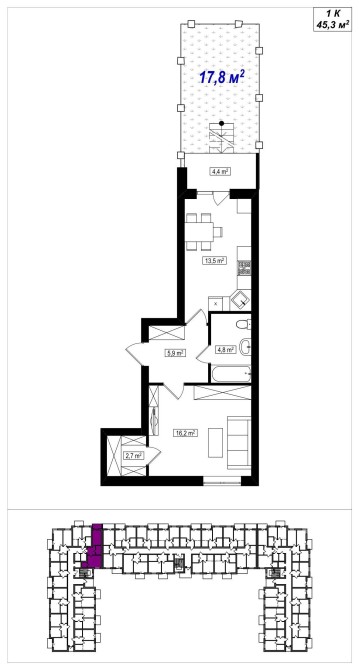 1-кімнатна квартира 45,3 м2 із власною ділянкою 18 м2.