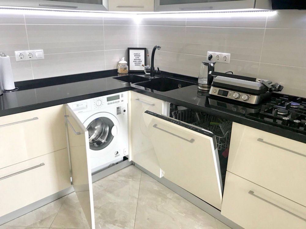 посудомоечная машина, стиральная машина, духовка, газовая варочная поверхность, два кондиционера, индивидуальное отопление (газовый котёл), тёплые полы по всей квартире, где плитка.