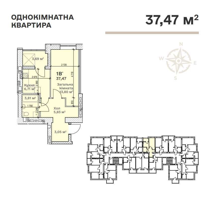 Продаж 1-к квартири площею 36,8 м2 в НОВОМУ житловому комплексі Сімейний у Димері.