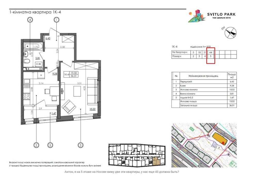 Продаю 1-к квартиру в ЖК «Світлопарк». Загальна площа 38,1 кв.м. (Збільшилася після замірів БТІ).