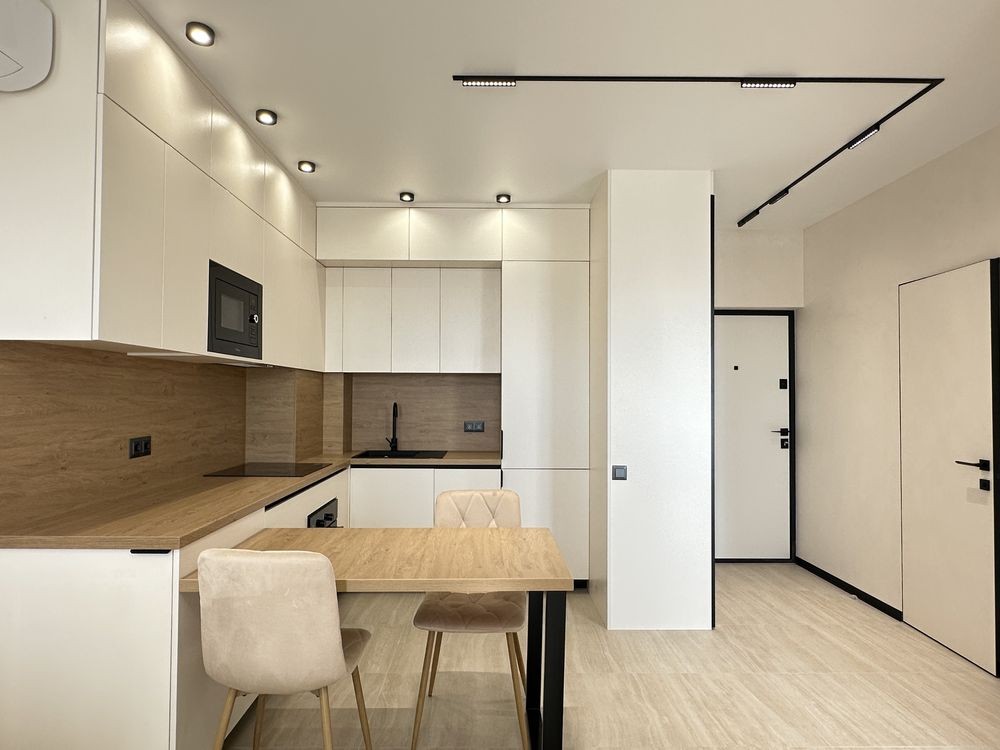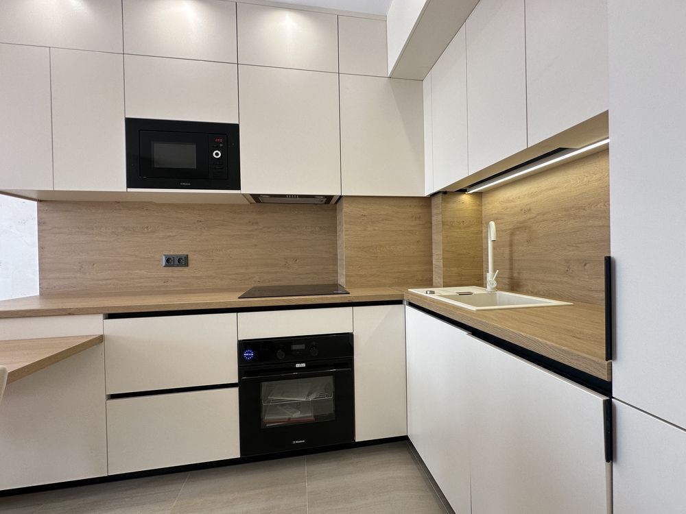 • вбудована кухня + вся техніка (варильна поверхня, духова, холодильник, мікрохвильова, посудомийка)