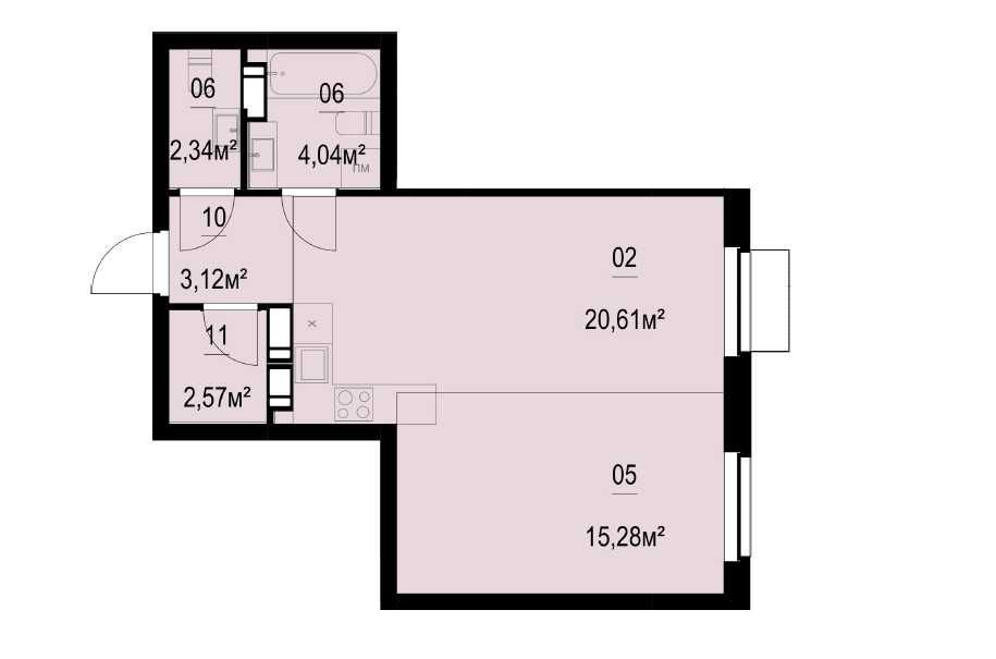 Кухня вітальня – 20,6 м², спальня 15,3 м²