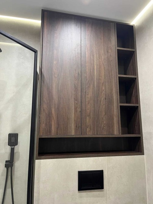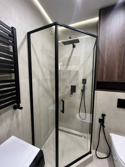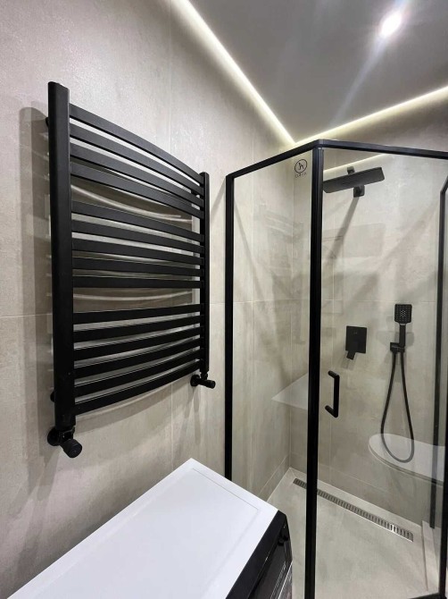 В санвузлі є душова кабіна, рушникосушка, пральна машина, дзеркало, та шафа для особистих речей
