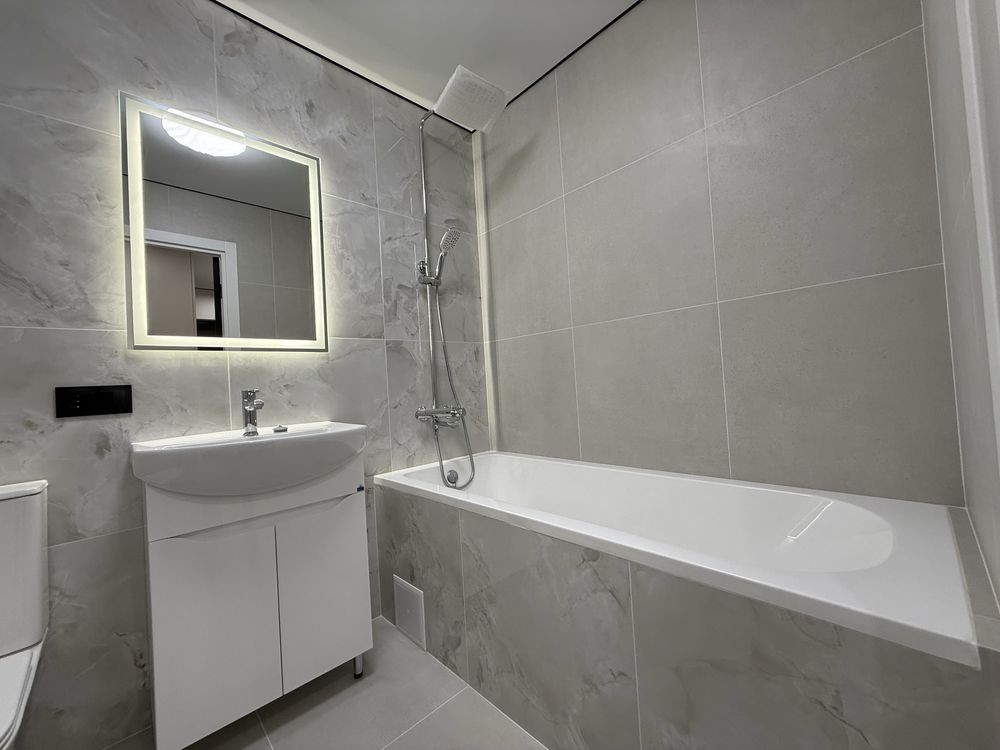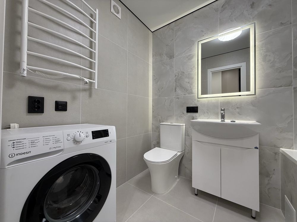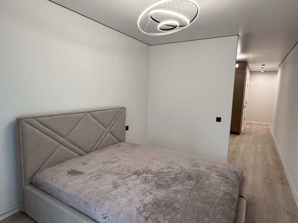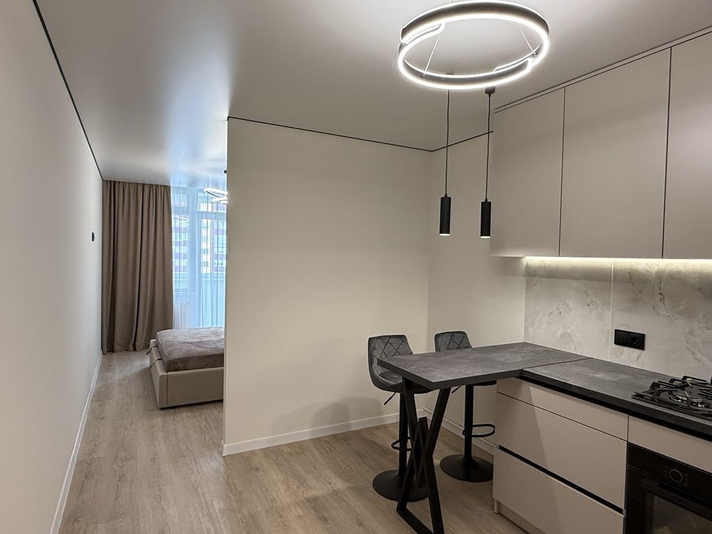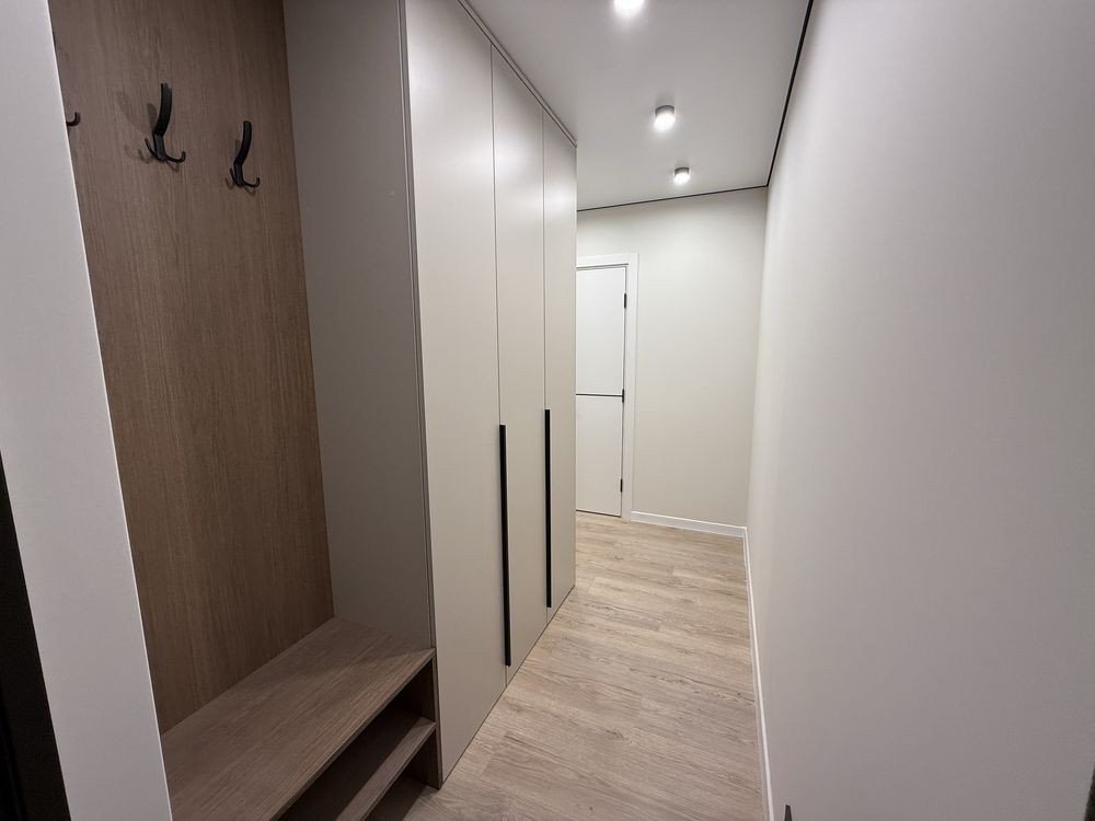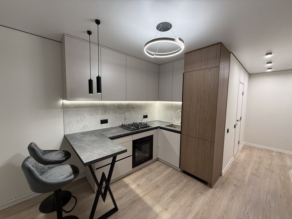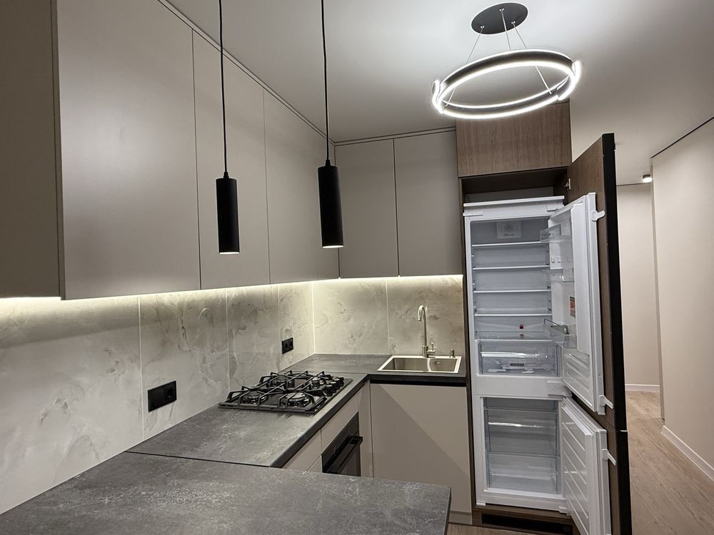 Укомплектована всіма необхідними меблями та технікою (кухонні меблі, двоспальне ліжко, велика шафа у прихожій, холодильник прихованого монтажу, пральна машина, духовка, газова поверхня, прихована витяжка)