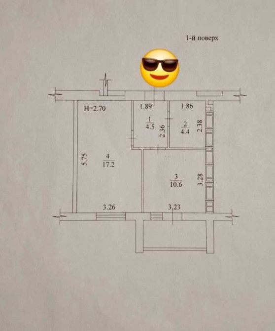 Общая площадь — 39 м², жилая комната — 17,2 м², кухня — 10,6 м².