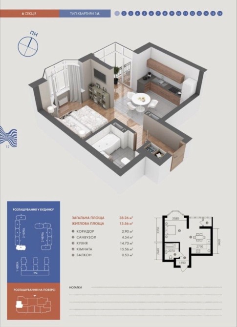 ​Планування: Раціональні 38 м², що включають затишну спальню та простору кухню-студію для вечорів з друзями.