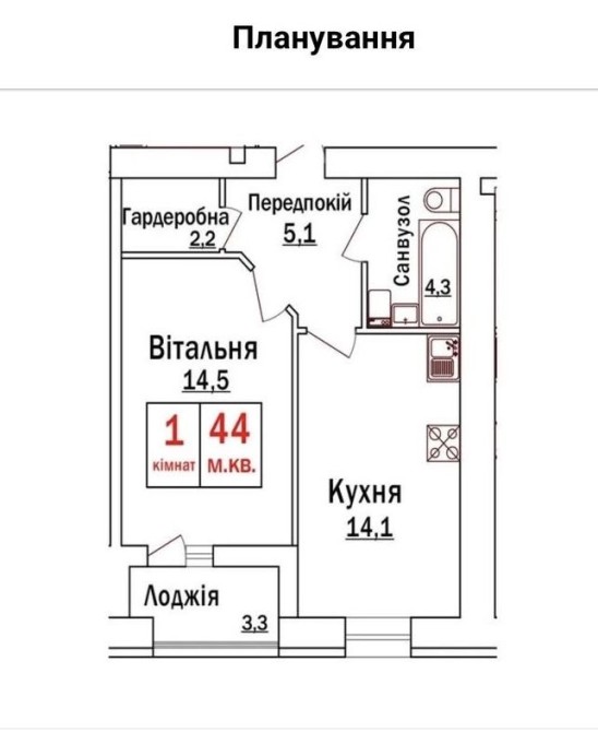• Загальна площа 44 м2