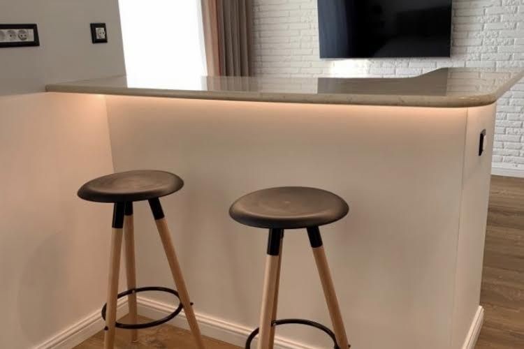 Столешница кухни и барной стойки выполнена из натурального мрамора.