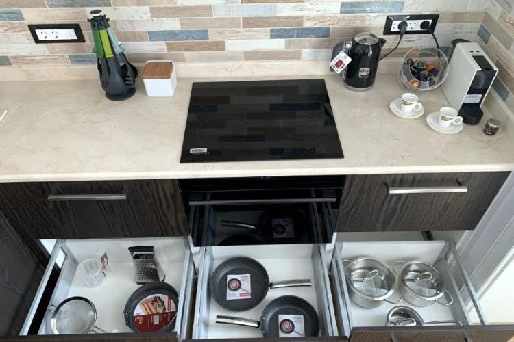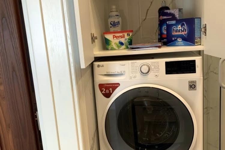 Есть вся бытовая: телевизор Samsung 55", кондиционер Daikin, индукционная плита Samsung, духовка с функцией микроволновки Samsung, современный холодильник Samsung, автономный котел Protherm, чайник Kenwood, кофемашина Nespresso, аккумуляторный пылесос Bosch, утюг Philips , стиральная машина LG с функцией сушки, акустическая система JBL, посудомойка SIEMENS и еще много всего.