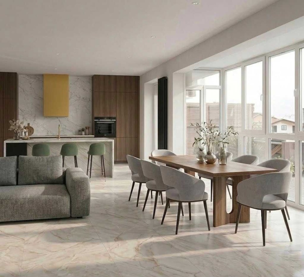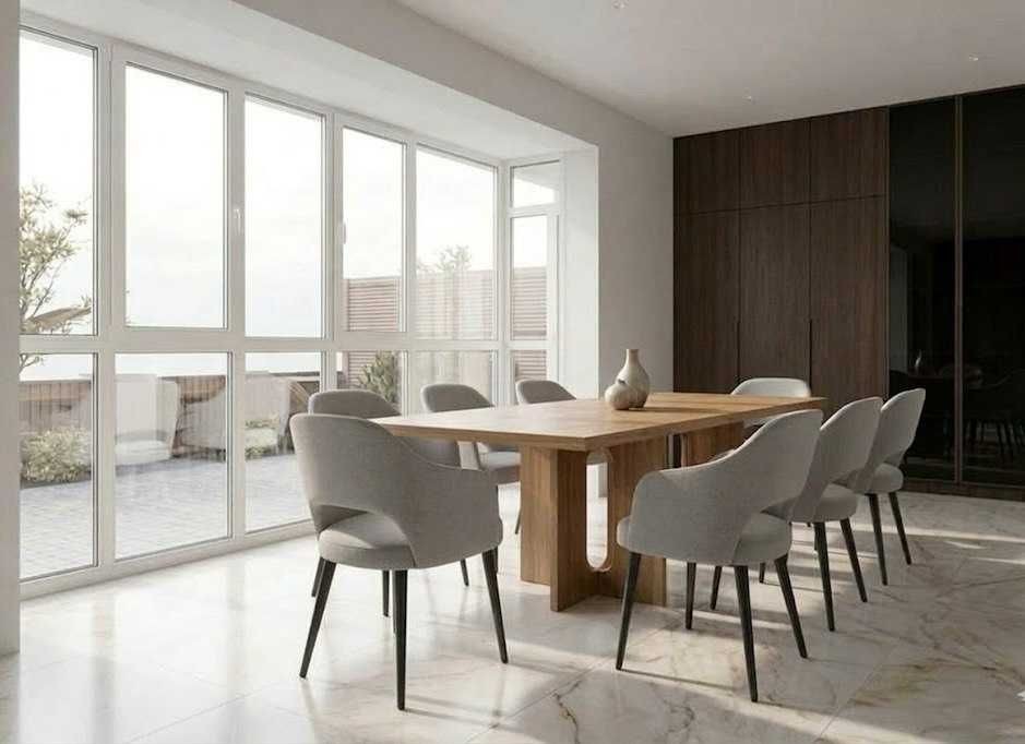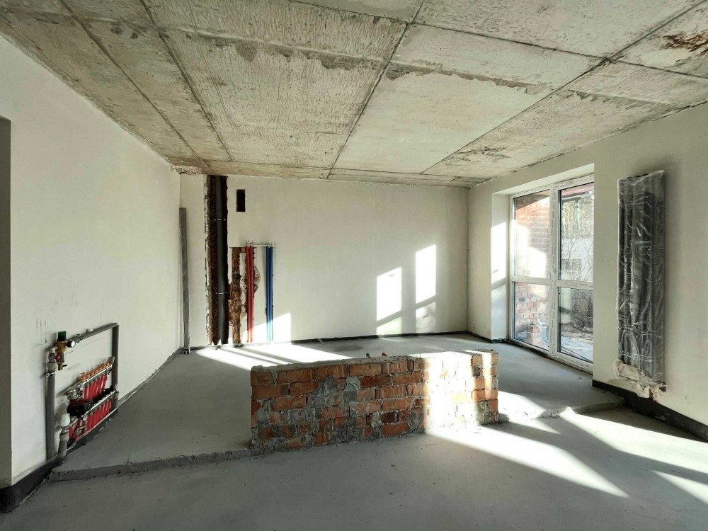 В квартирі простора кухня-студія 42м² з обладнаним кухонним острівком. Великі панорамні вікна з виглядом на зелену зону . Два санвузли та велика кухня-студія