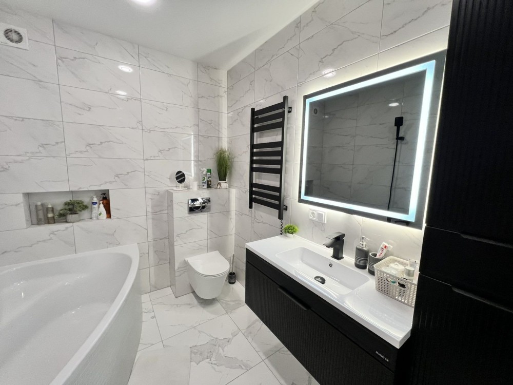 Вашій увазі пропонується 2-кімнатна квартира в новому будинку на зручному третьому поверсі. Загальна площа квартири - 60 квадратних метрів, кухні -15 квадратних метрів. Ремонт зроблений в приємних світлих тонах,меблі та техніка - лишаються. Як бонус- своє паркомісце. Торг можливий. Покази в зручний для Вас час.