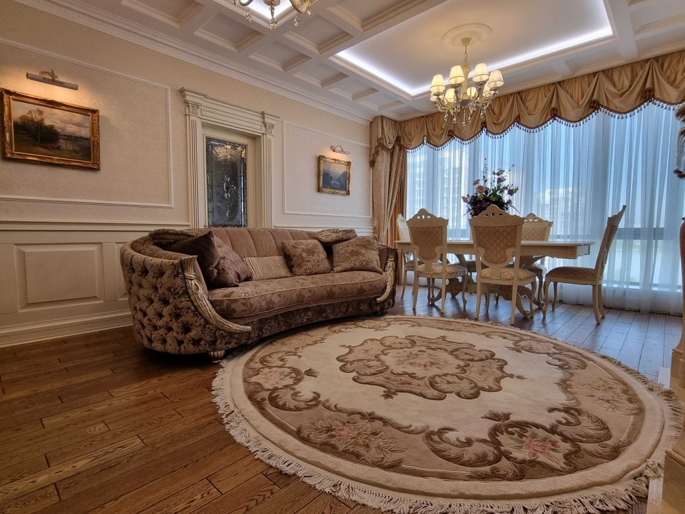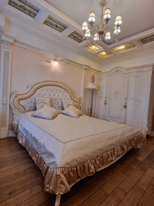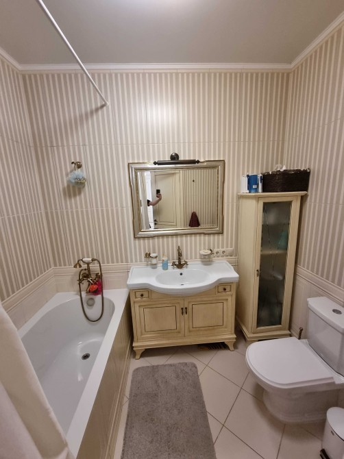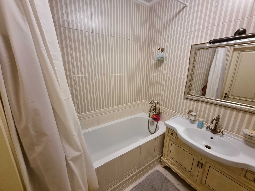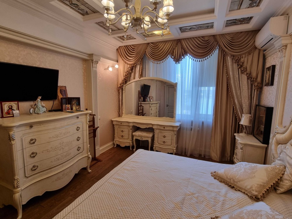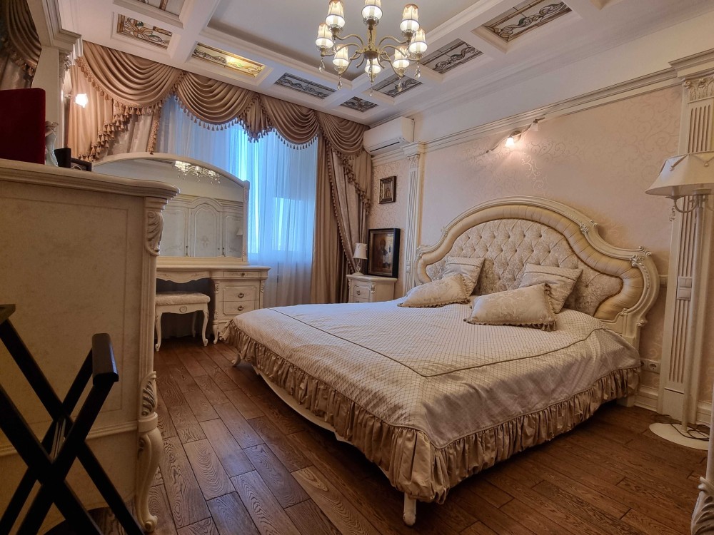 Оренда 2-х кімнатної квартири в елітному житловому комплексі, ремонт в класичному стилі, вітальня, спальня, два санвузли, гардеробна, господарське приміщення, якісні меблі, побутова техніка, кондиціонери, підігрів підлоги. В житловому комплексі цілодобова охорона, відеоспостереження, закрита територія, дитячі майданчики, набережна, паркінг наземний та підземний.