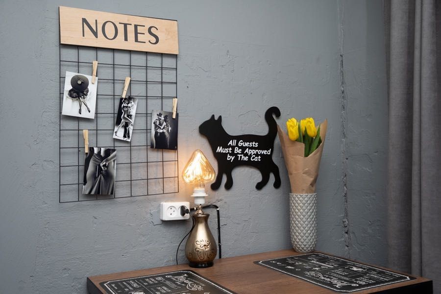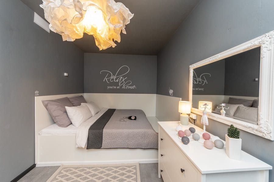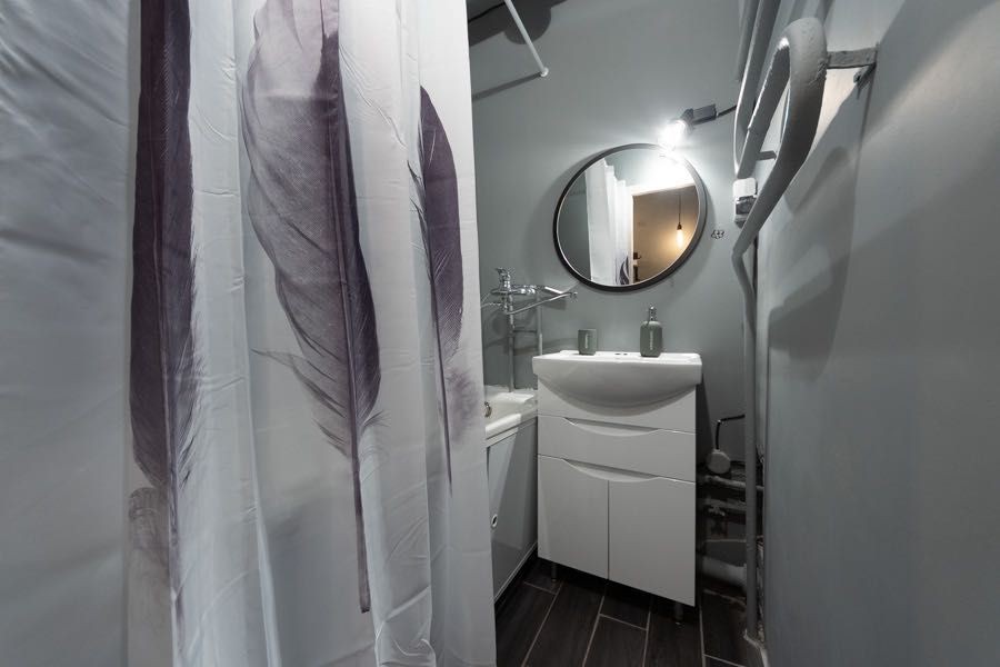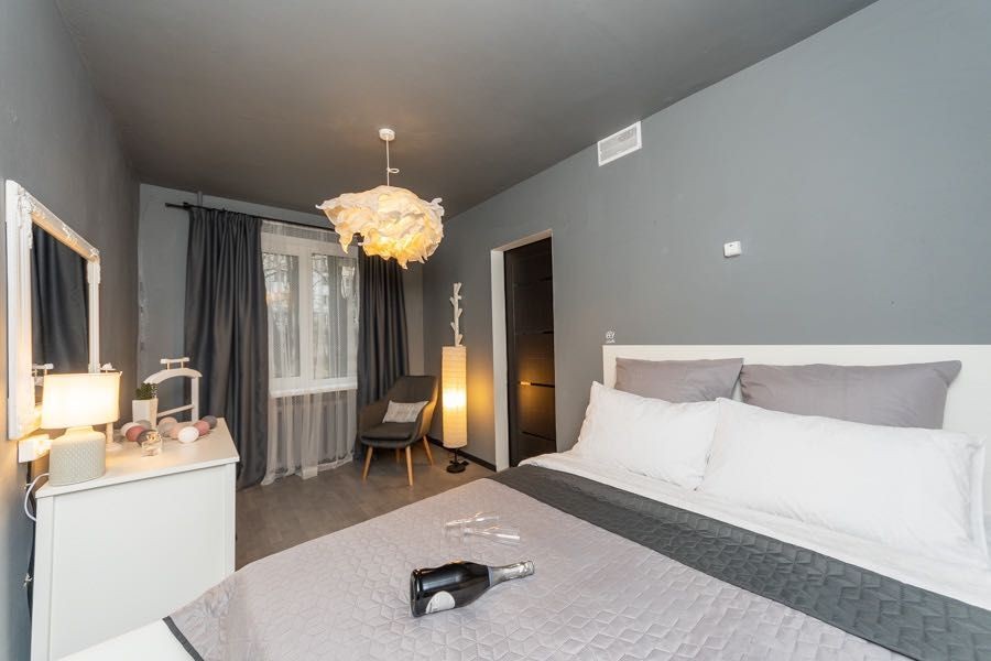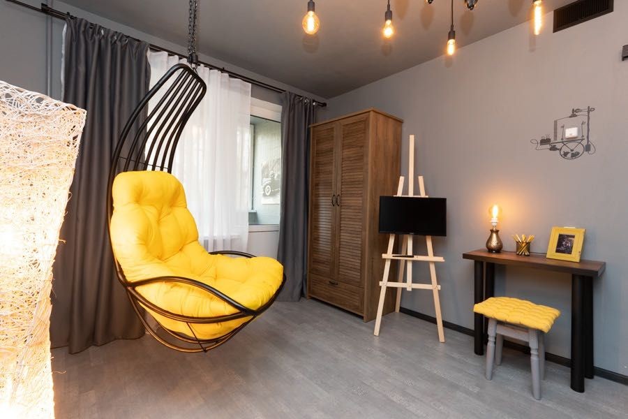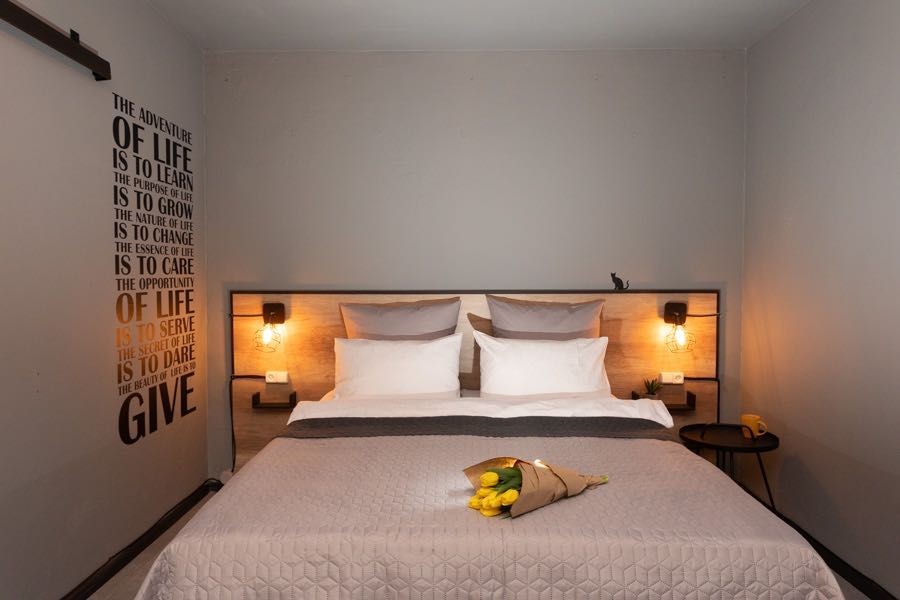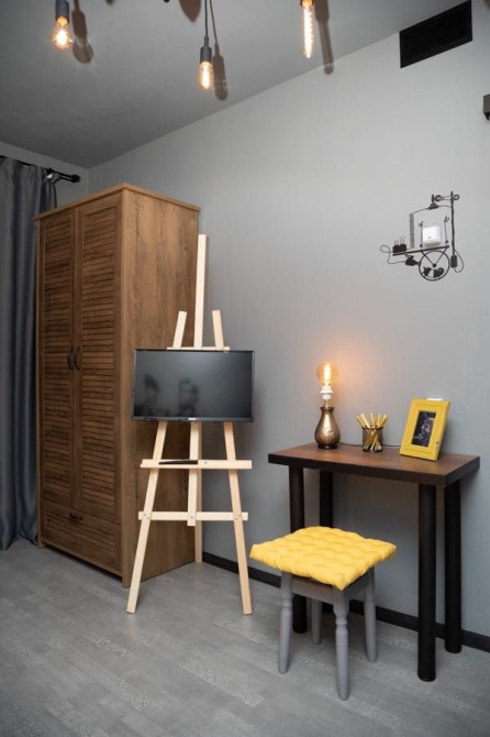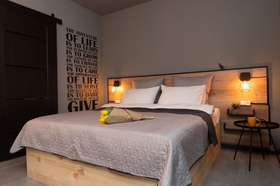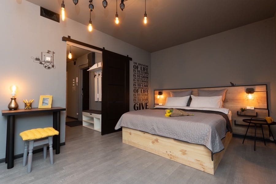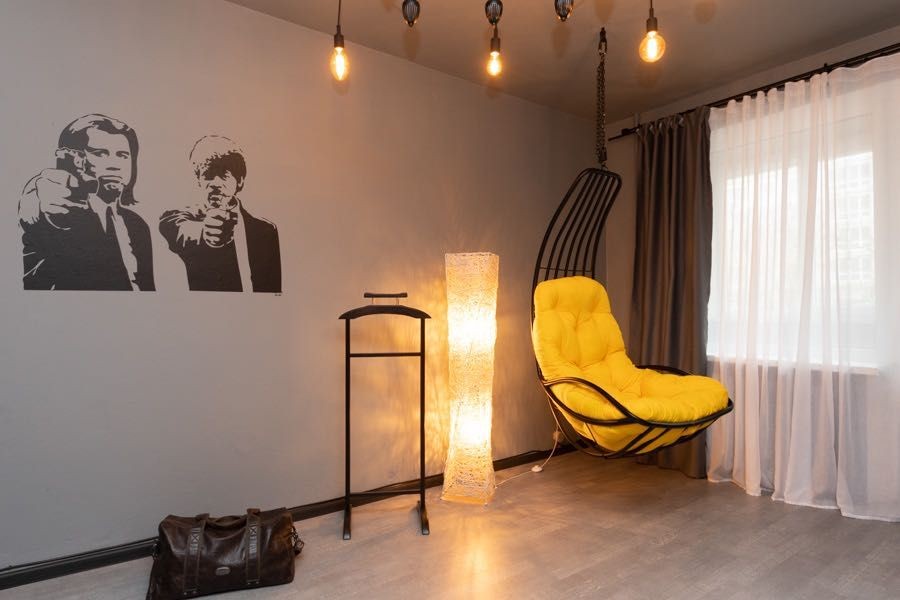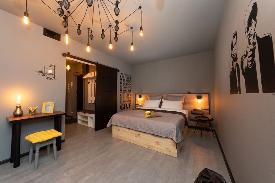 Квартира оформлена в лофтових кольорах, витримана в одній кольоровій гамі, укомплектована 2 великими двоспальними ліжками з ортопедичними матрацами, підвісним кріслом-гойдалкою, безліччю цікавих авторських деталей: малюнками на стінах, лампами Едісона, світильниками.