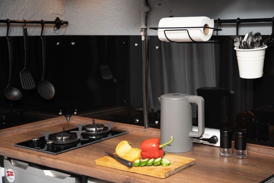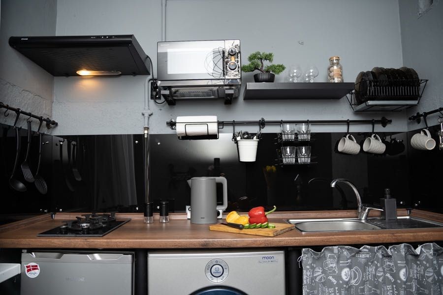 Кухня укомплектована побутовою технікою: холодильником, мікрохвильовкою, газовою плитою, пральною машиною, чайником, а також усім необхідним посудом.
