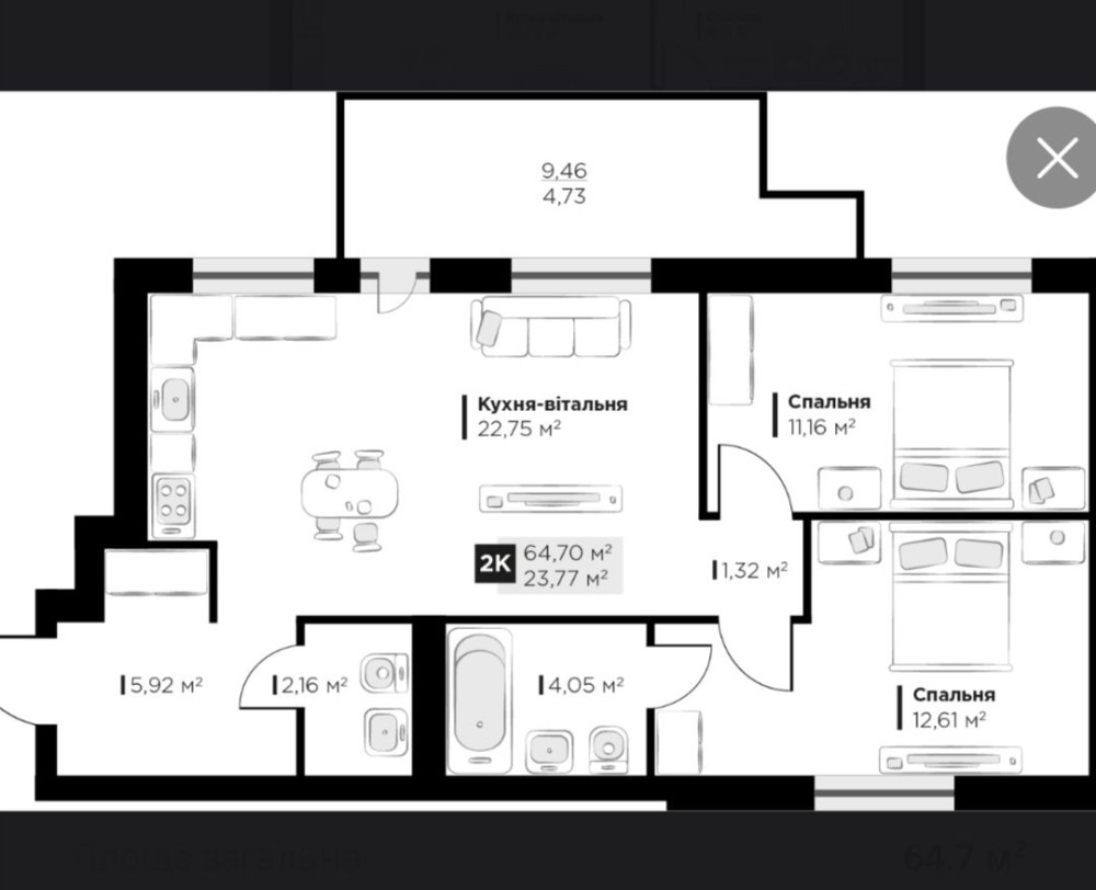 • Загальна площа 64.7 м2
